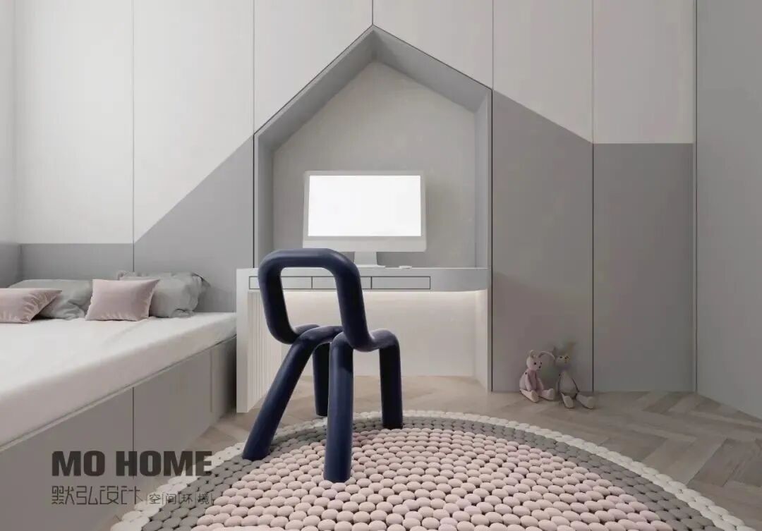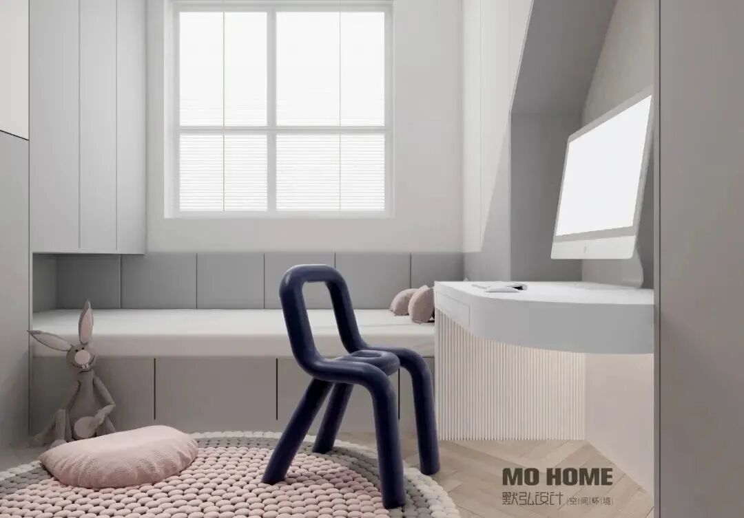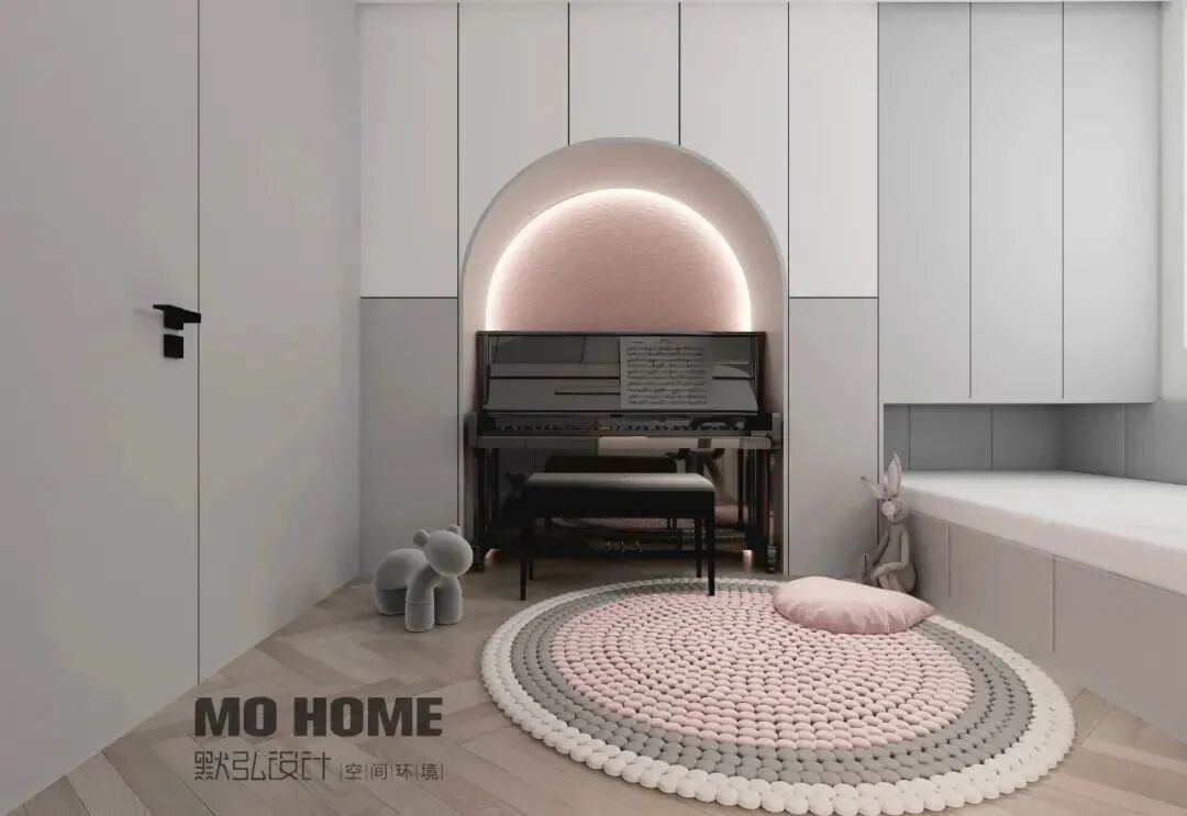 -儿童房是孩子自由生活的天地,单纯而空灵,捉摸不定的灰与柔软的粉色搭配,呈现孩子的童趣朦胧之美,低调内敛地给孩子传递温暖、爱与智慧。