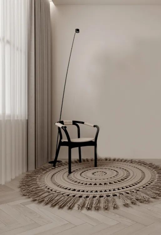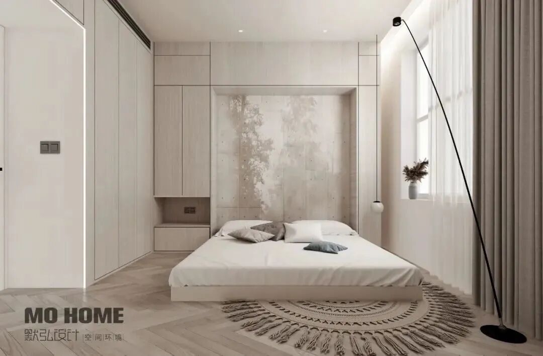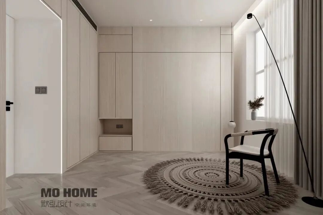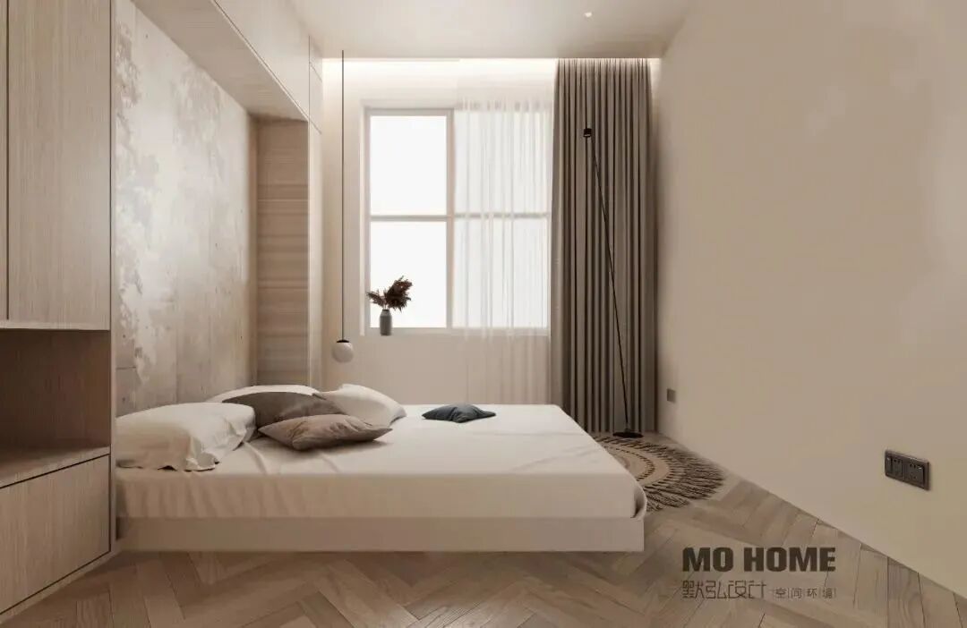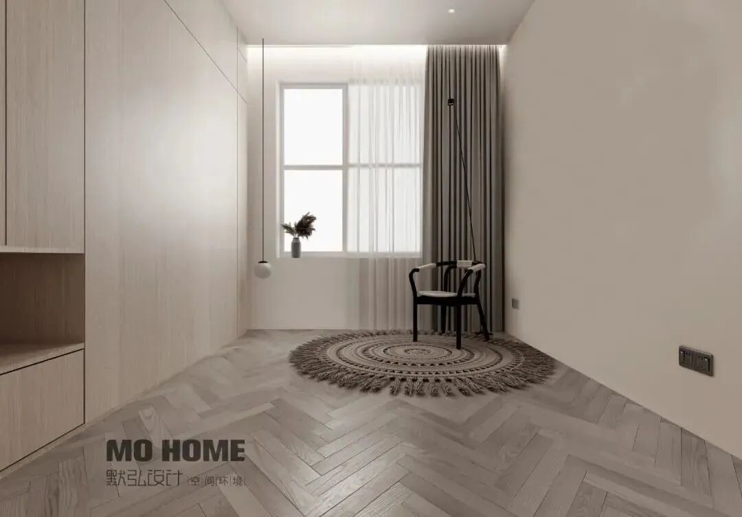 次卧用来给客人和偶尔过来的老人居住,风格淡然而悠远,延续整体简练质朴的风格,同时用针织质感的地毯和斑驳纹理的背景墙打造空间的温馨感,可折叠隐藏的床能够瞬间将这里变为孩子玩乐、健身或者会客的场所,设计美感与实用性巧妙融合,卧室又可化身作为一个多功能厅。