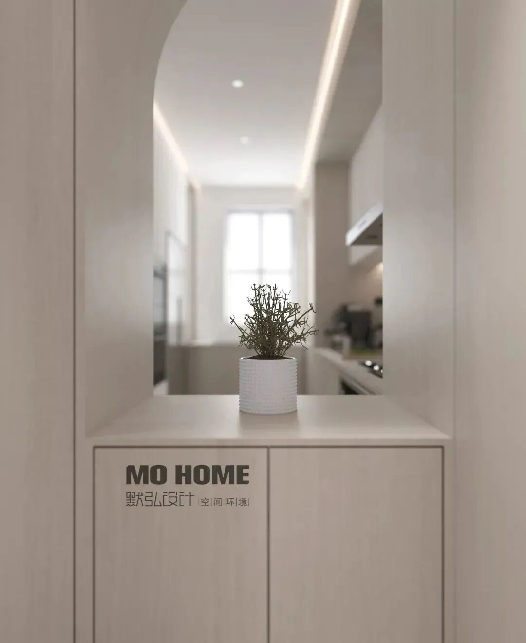 -玄关,是空间对主人的第一个拥抱。新设柜体占据原厨房空间,弧形孔洞让玄关采光充足,开阔通透的空间搭配清新自然的木色,进门的第一眼舒适惬意,是家的温度。