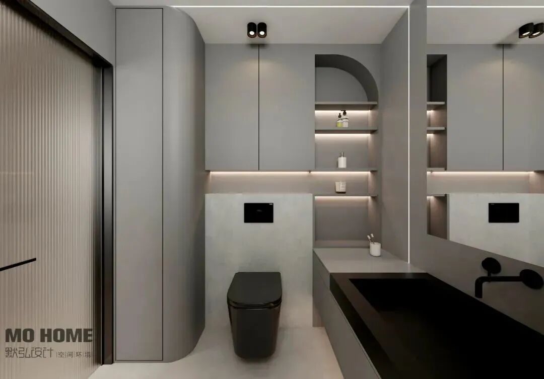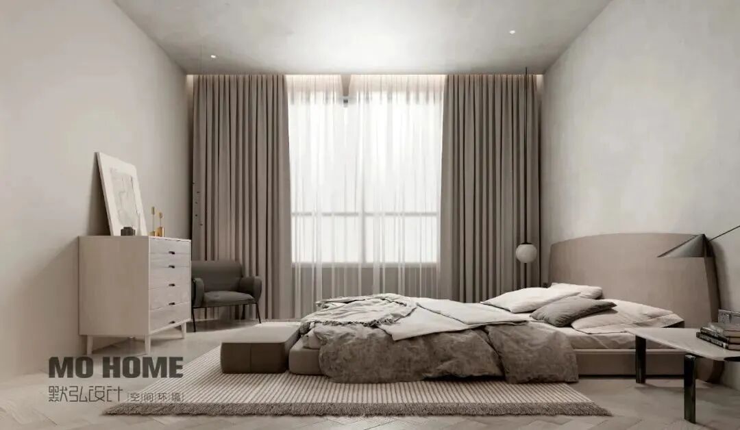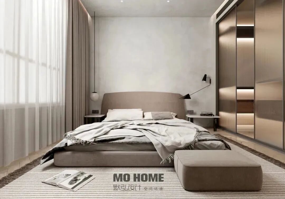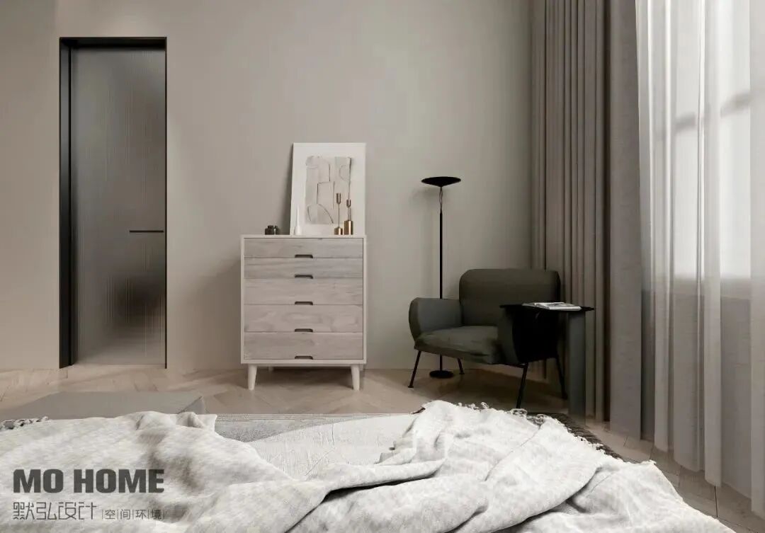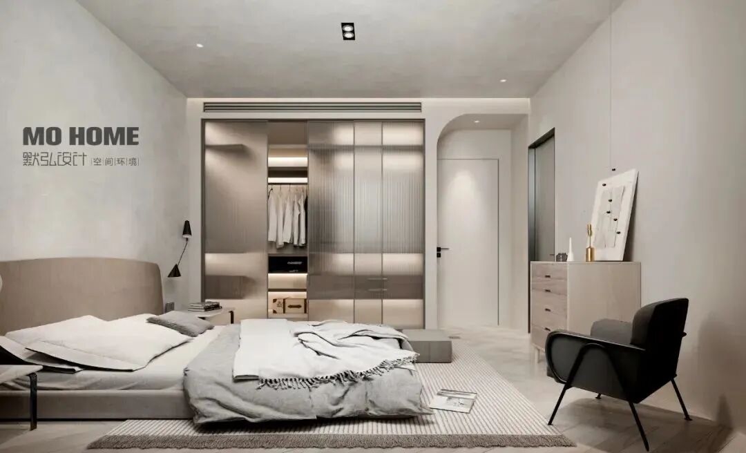 -主卧作为主人最为私密的休憩空间,仿若心灵的栖息之地,毋需繁多装饰,“黑白灰”辅以极简设计,返璞归真的生活有让人心安的从容静谧。