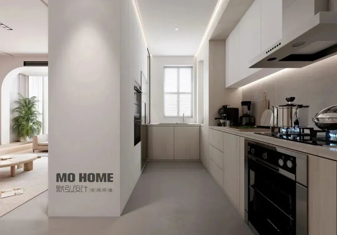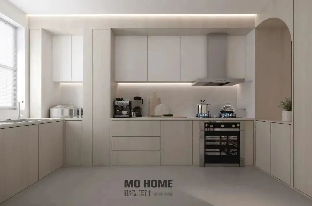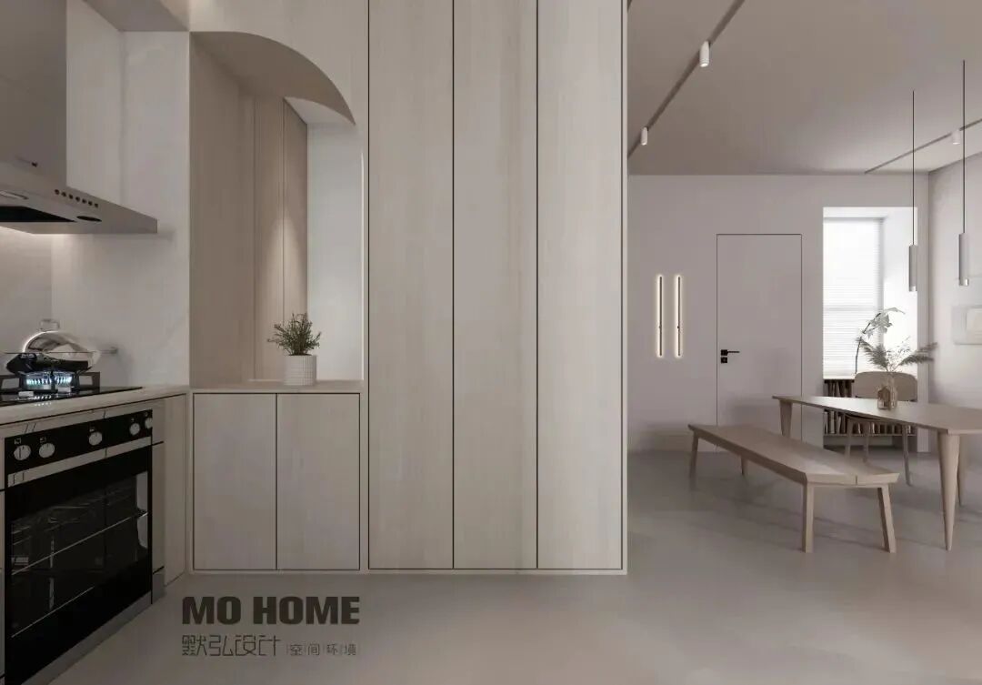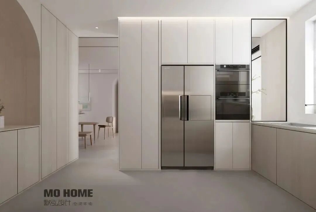 -冰箱、微波炉等电器采用隐藏式设计,让厨房空间浑然一体,简洁大气。素净木色搭配干净纯白,烹一碗雅淡汤羹,厨房燃气的烟火气恰似生活平淡之美。