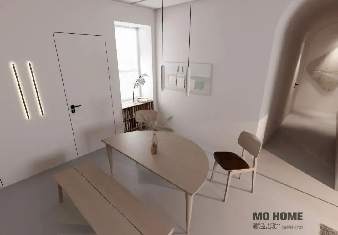朴素古意的条凳与现代造型的餐椅、半圆半直的餐桌形成微妙的对比,传统中式经过现代简约演绎延伸让人耳目一新。与传统中式的沉稳厚重不同,空间更显清雅安宁。