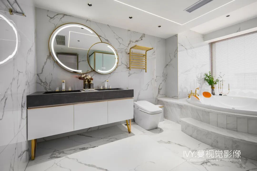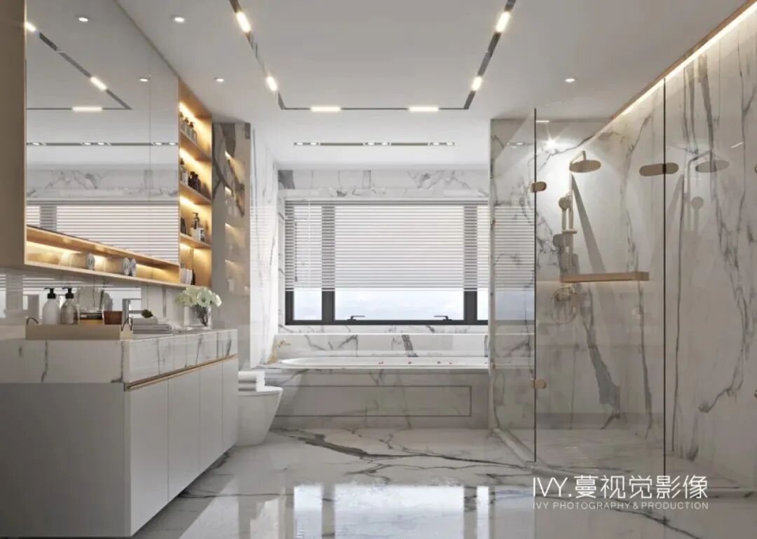 设计师在满足人性化设计——干湿分离的基础上,极致利用空间,以隐藏式灯光的引入、精致布局的收纳设计,搭配意大利rex特级雪花白岩板丰富的细节纹理,打造出轻盈、灵动又不失精致格调的空间语境。
