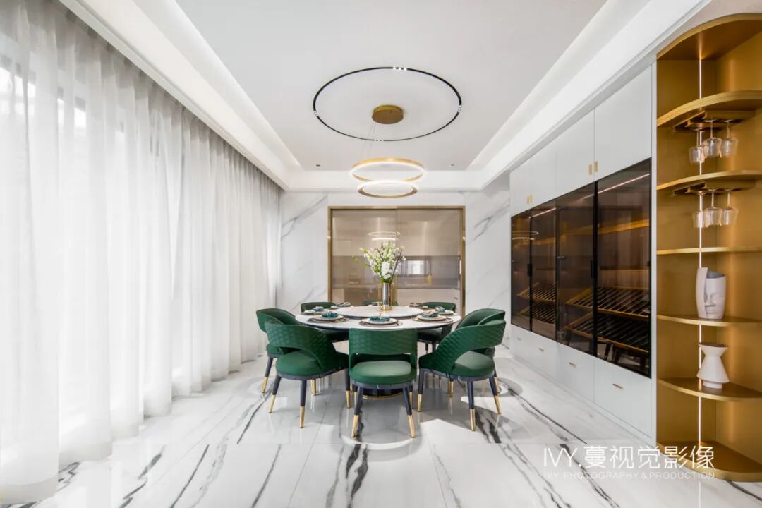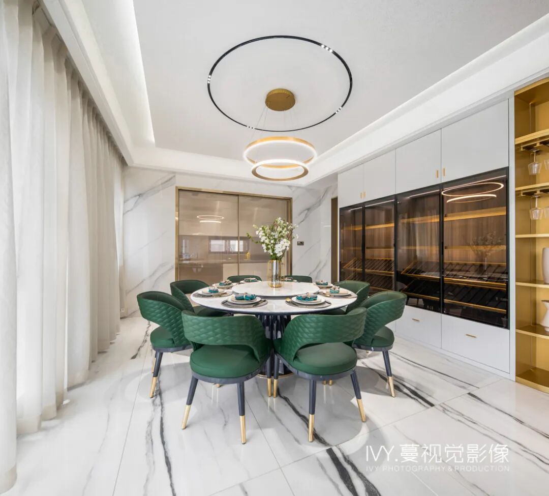 作为犒赏味蕾的圣地,餐厅的设计尤为讲究。一抹自然流行的墨绿色打破了单一的空间色调,使整个空间迸发出生机与舒适。夸张而不突兀的艺术圆形灯饰,让空间的沛然生机得到进一步释放。暗藏灯带的通透酒柜,加以茶色窄框玻璃柜门,有着令人一眼心动的魅力。