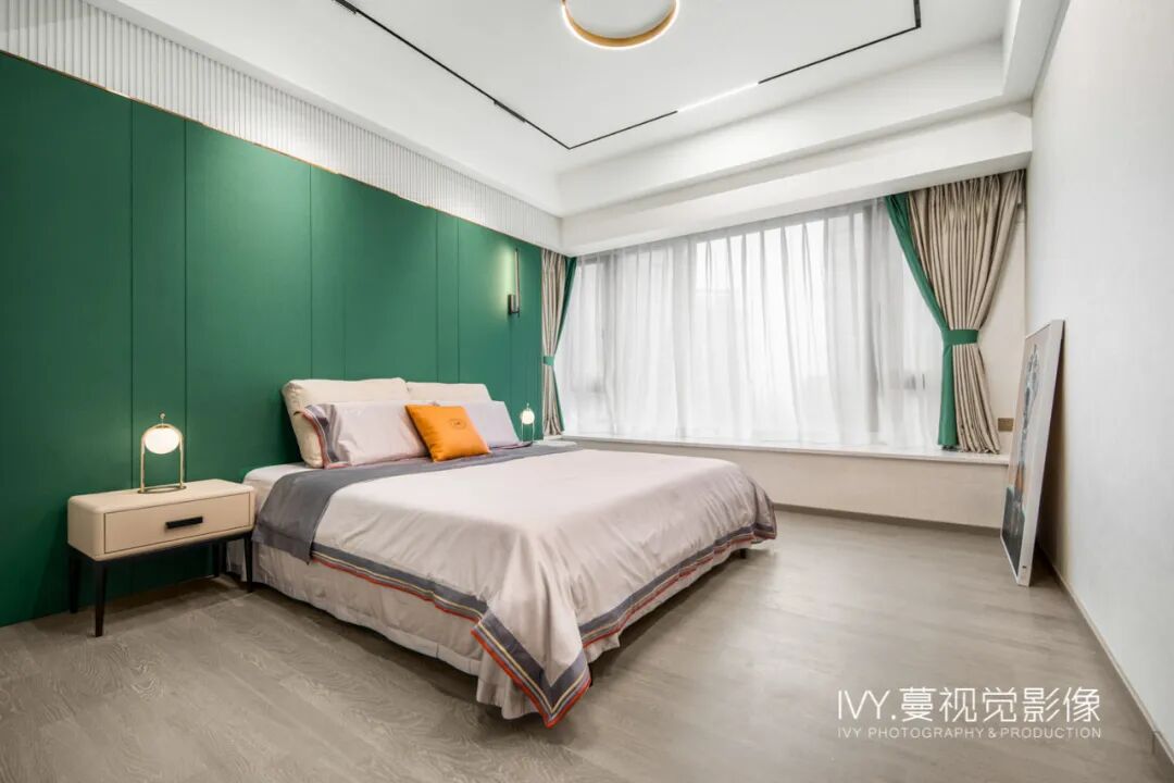 次卧以墨绿色为主色调,清新且治愈,与餐厅颜色遥相呼应,不同空间的整体性隐隐体现出来,悦动的色泽展露出时髦高调的优雅腔调。