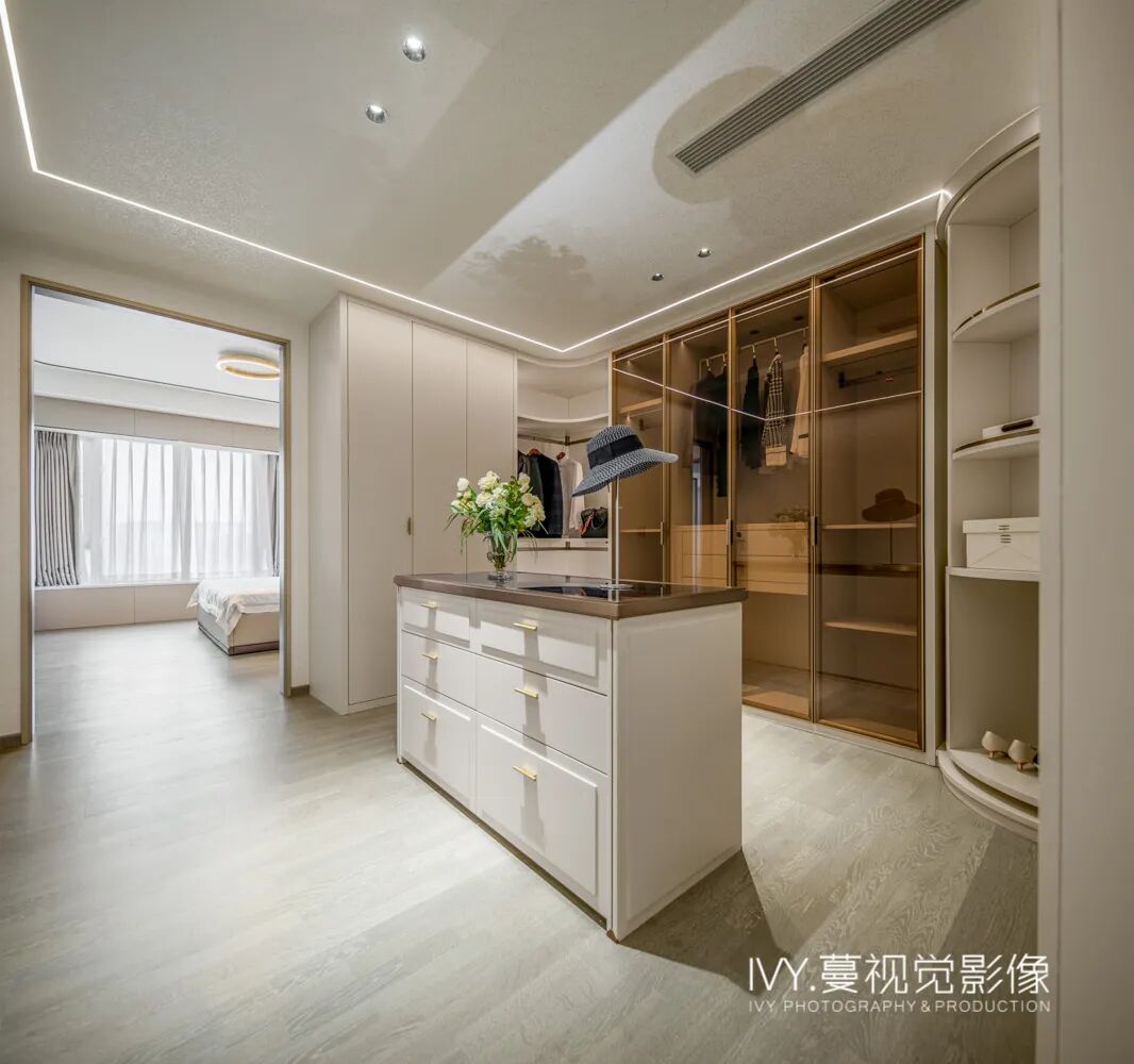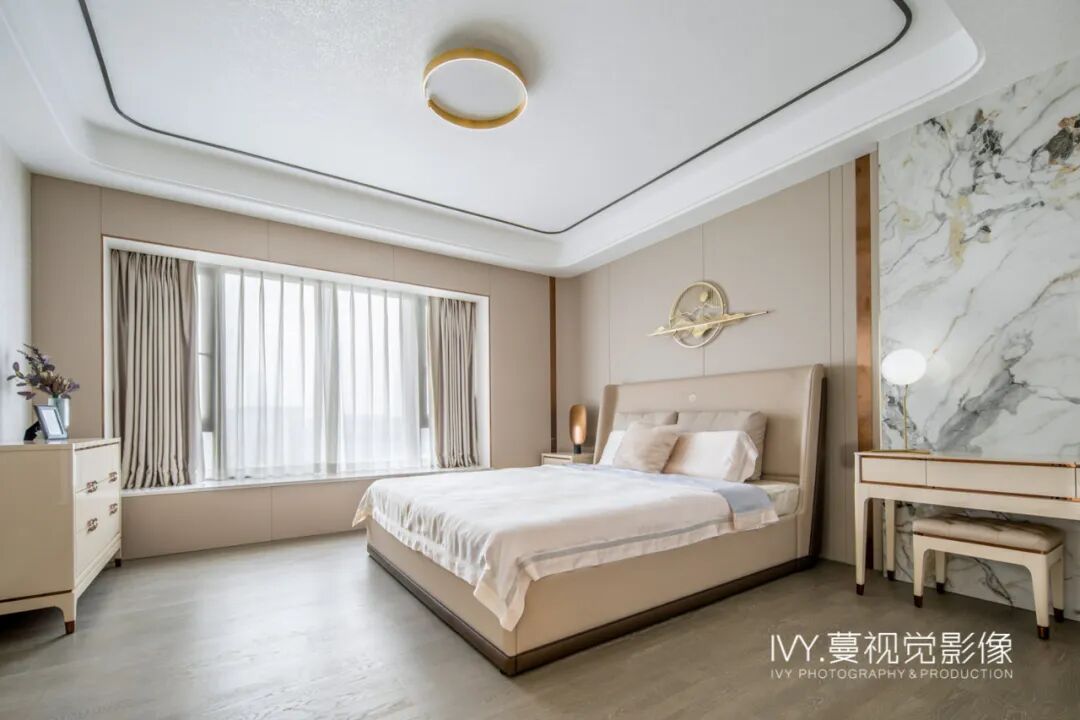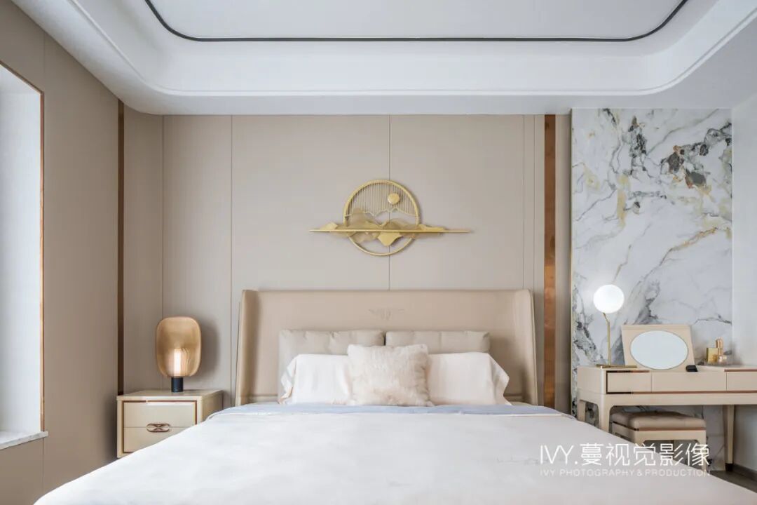 主卧以淡雅的米色为主色调,温馨舒适,背景墙与客厅的岩板材质一脉相承,少许金属点缀不仅增加了层次,也呼应了其它空间的轻奢气质。