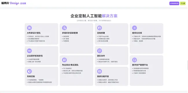 ▲ 暗壳AI-风格渲染生成效果 针对家居品牌端在精准获客、宣传物料制作、数据分析及预判等方面的痛点,暗壳AI也推出了针对性解决方案,比如“暗壳AI生态库”,以场景赋能、流程嵌入、生态互联为核心逻辑,链接设计师与品牌端,实现供需两端的价值提升与共赢;“品牌企业库”以专属管理、精准触达、数据驱动为核心,构建专属的产品数字化管理与设计师协同平台。在营销宣传方面,暗壳AI可快速生成高质量美学物料和时尚视觉内容,极大降低品牌营销成本。除此之外,暗壳AI还可提供企业定制人工智能解决方案,根据企业具体需求提供针对性功能和技术服务,如:API + 定制,深度训练合作等。