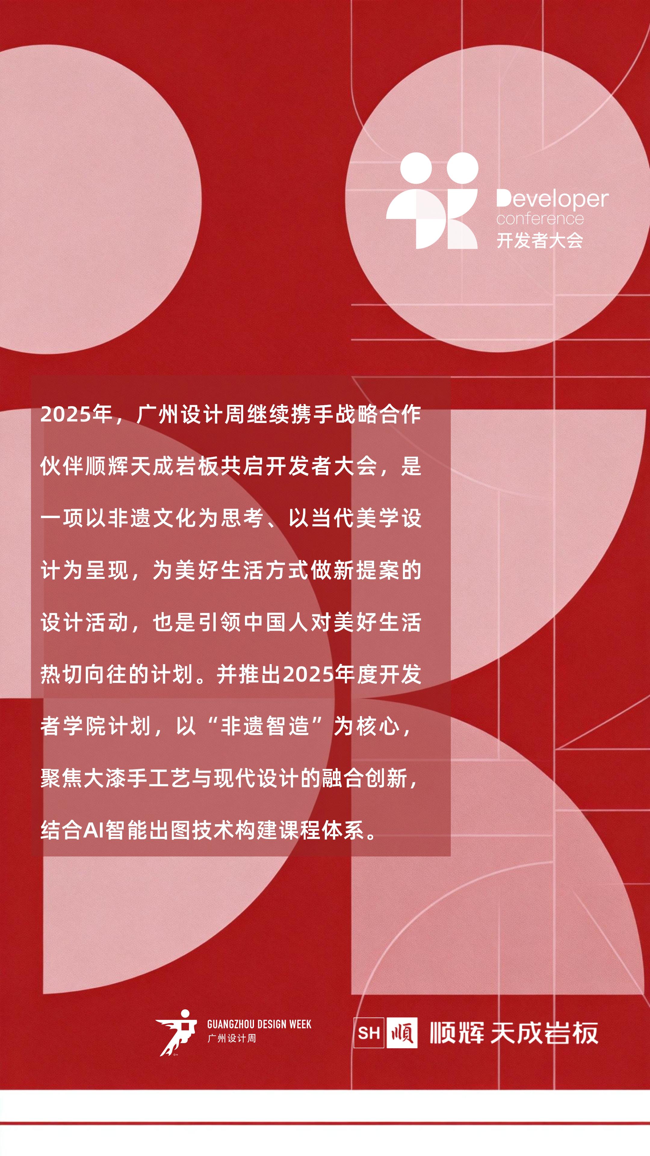 在科技飞速发展的2025年,一场关于传统与创新对话的盛宴在全国悄然展开。广州设计周与顺辉天成岩板携手发起的开发者大会,以"非遗智造"为核心理念,开启了一场贯穿全年的设计创新之旅。 从春到冬,这场创新盛会先后在上海、苏州、北京成功举办三场开发者学院活动,最终在广州迎来年度盛典,形成了完整的"三城一会一榜单"活动体系。每一站都深度聚焦非遗大漆技艺与AI技术的创新融合,为设计行业注入了新的活力。 01 三城·上海站 开启非遗与AI的首次对话 三月春申江畔,开发者大会首站在上海启航。首场活动以"非遗智造"为主题,汇聚了行业专家与设计师共同探讨大漆工艺与AI技术的创新融合。 顺辉天成岩板市场总监孙庆带来品牌在大漆工艺与现代岩板融合方面的创新实践,展示了传统工艺的当代转化路径。豆绘科技联合创始人祝爽现场演示AI工具如何解构大漆纹样,让与会设计师亲眼见证技术为非遗带来的新生。 在这场开创性活动中,15位设计师通过"AI大漆面材"创作实践,亲身体验文化传承与科技创新的碰撞。导师现场指导学员掌握AI辅助设计的方法,为非遗技艺的现代化应用开辟了新思路。上海站的成功举办,为全年活动奠定了坚实基础,也让参与者看到了非遗文化在当代设计中的新可能。