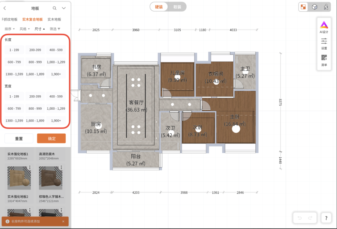 1. 精准筛选,告别返工还在为“看着好看放不下”而反复修改方案?本次更新新增按尺寸精准筛选功能,帮你一步到位。 现在,用户可按长度和宽度筛选材质: