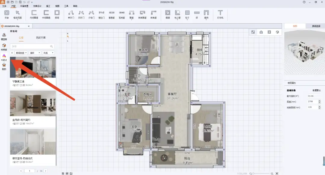 AI设计想要快速实现设计构想,不妨试试【AI设计】功能:上传户型图,选择心仪的风格模板,AI帮你一键生成匹配的3D方案,让你轻松实现从“心动”到“行动”的转变。