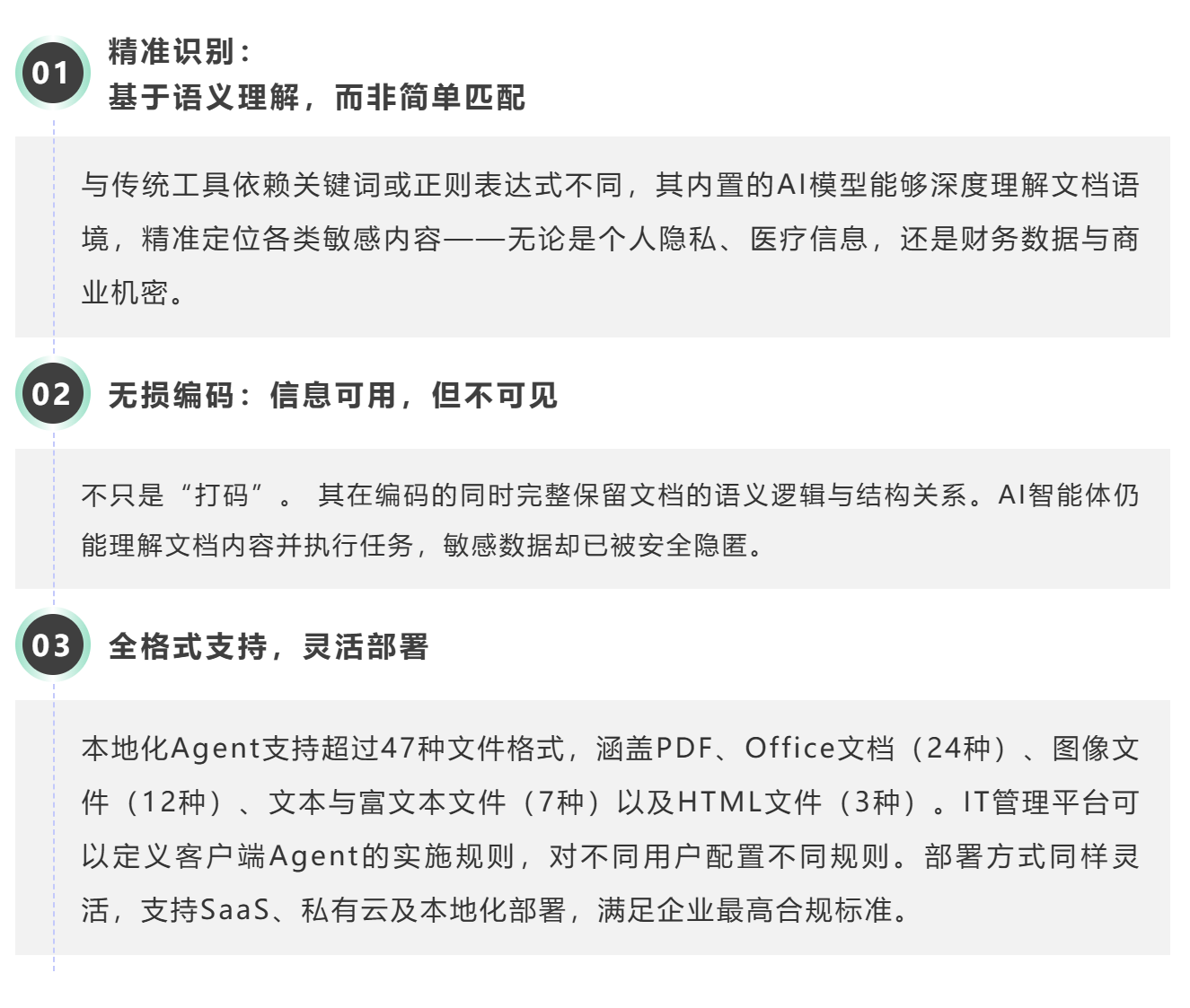 传统安全技术侧重隔离与阻绝,对静态风险有效,却难以应对AI对文档内容的深度理解与防控。破解这个悖论需要一种新形态的技术,让AI能读取足够的内容以便执行任务,但又无法获取用户的敏感信息。 福昕AI文档防护Agent的核心理念,是在AI智能体读取文件之前进行实时拦截,对文档中的敏感信息进行“无损编码”——让AI仍能理解文档语义、执行任务,但核心隐私数据已被安全隐匿。整套方案所采用的模型全部运行在本地,不调用任何外部模型,彻底杜绝文档外传的风险。最终仅输出编码后的文件,供内外部AI智能体使用,从源头上筑牢数据安全防线。