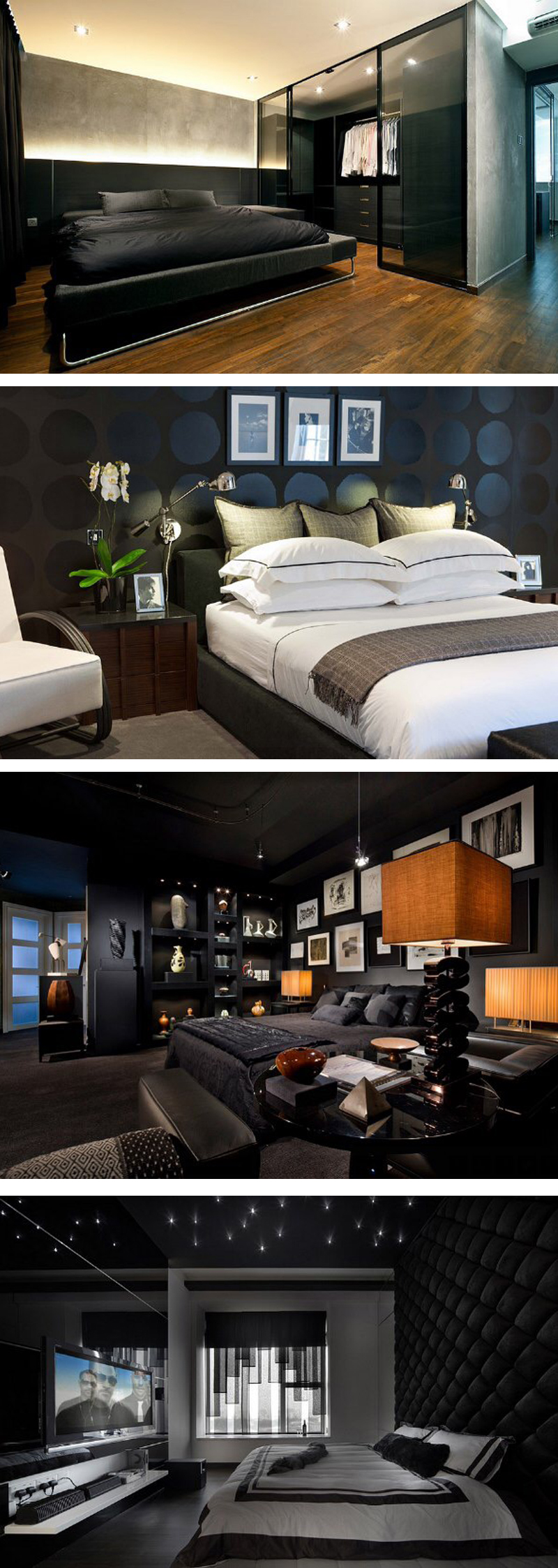 当代的卧室设计很多都有趋向于男性化的配色,选用的颜色大同小异。黑色和灰色的房间的基础色,尤其黑色常常用作奠基性的颜色。