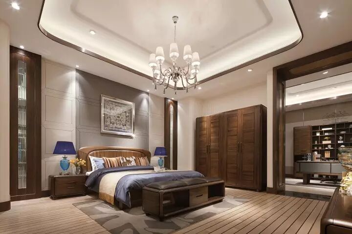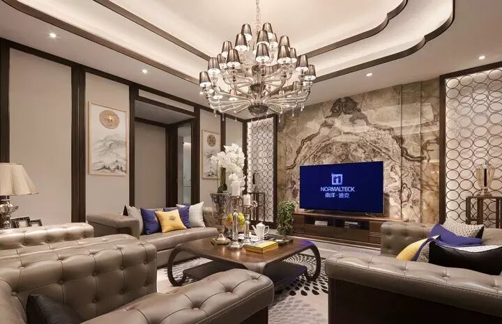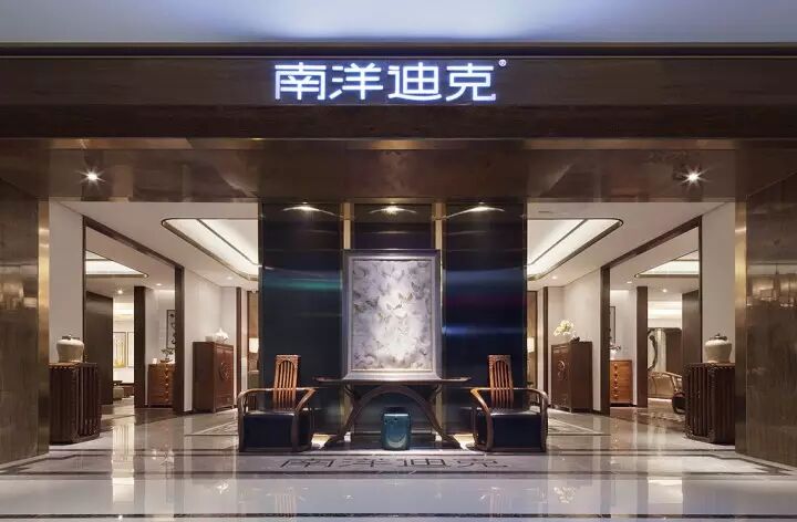 南洋迪克的家具整体风格是厚重而儒雅,我们在其中加入一些现代元素,运用金属包边的形式,即天花射灯周围都以金属边加以环绕,墙壁及门都镶有“金边”,目的是突显整套家具的和谐及历史沉淀。由于家具本身已用料很足,木质元素非常丰富,我们需要做到绿叶衬托红花的效果,才能提升产品的价值。因此在选材上我们用了非常简单的素色系列,再融入富有中国特色的扇子、装饰腰佩、水墨屏风、中国水墨挂画等中国元素使整个空间看起来稳重而又充满格调,真正达到“融古今,汇中西”的效果。